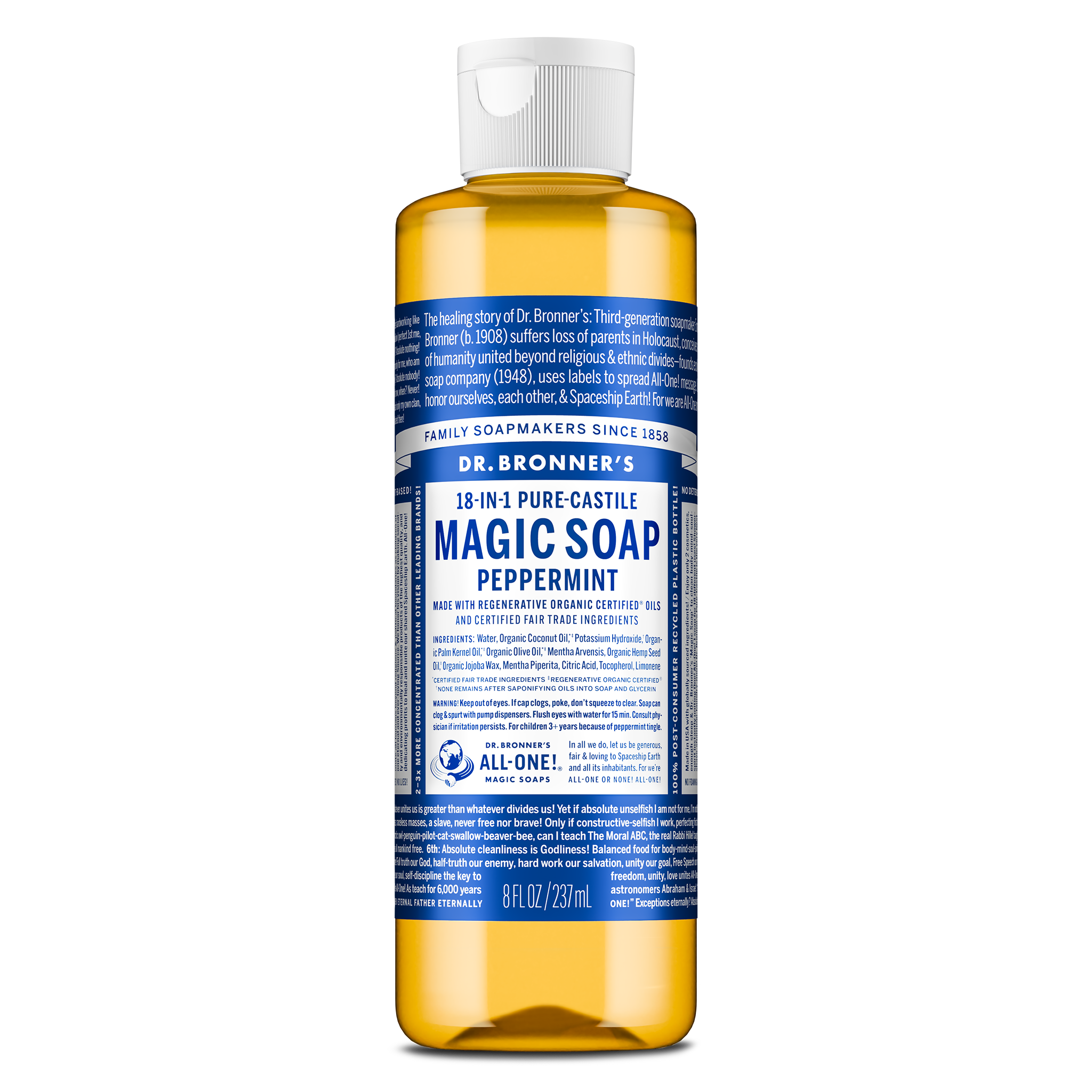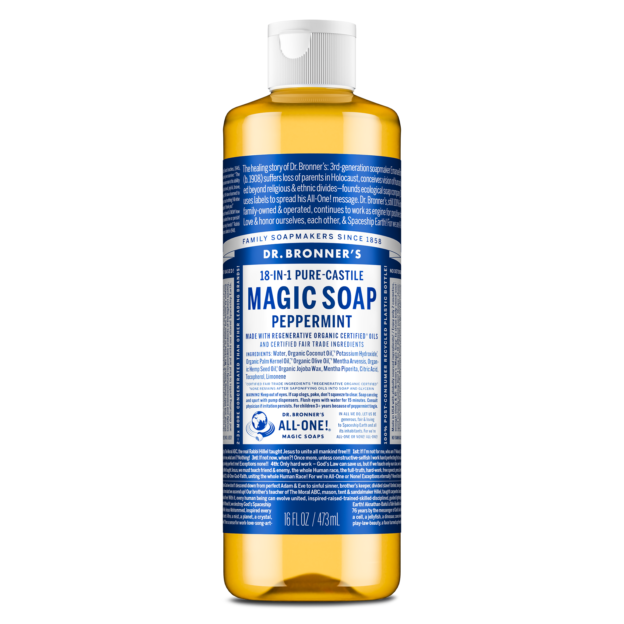 Dr. Bronner’s Peppermint Liquid Soap is scented with organic peppermint essential oil for a refreshing, clean feel that leaves skin feeling cool and awakens the senses. Made with a nourishing blend of Regenerative Organic Certified® oils, this true soap creates a rich, smooth lather that rinses clean—leaving skin feeling fresh and renewed. Great for everyday use, it’s crafted with ethically sourced, organic ingredients and contains no detergents, dyes, or added foaming agents. Vegan, made with organic oils, fair trade, and EWG Verified® for peace of mind—because caring for your body should also care for the planet!