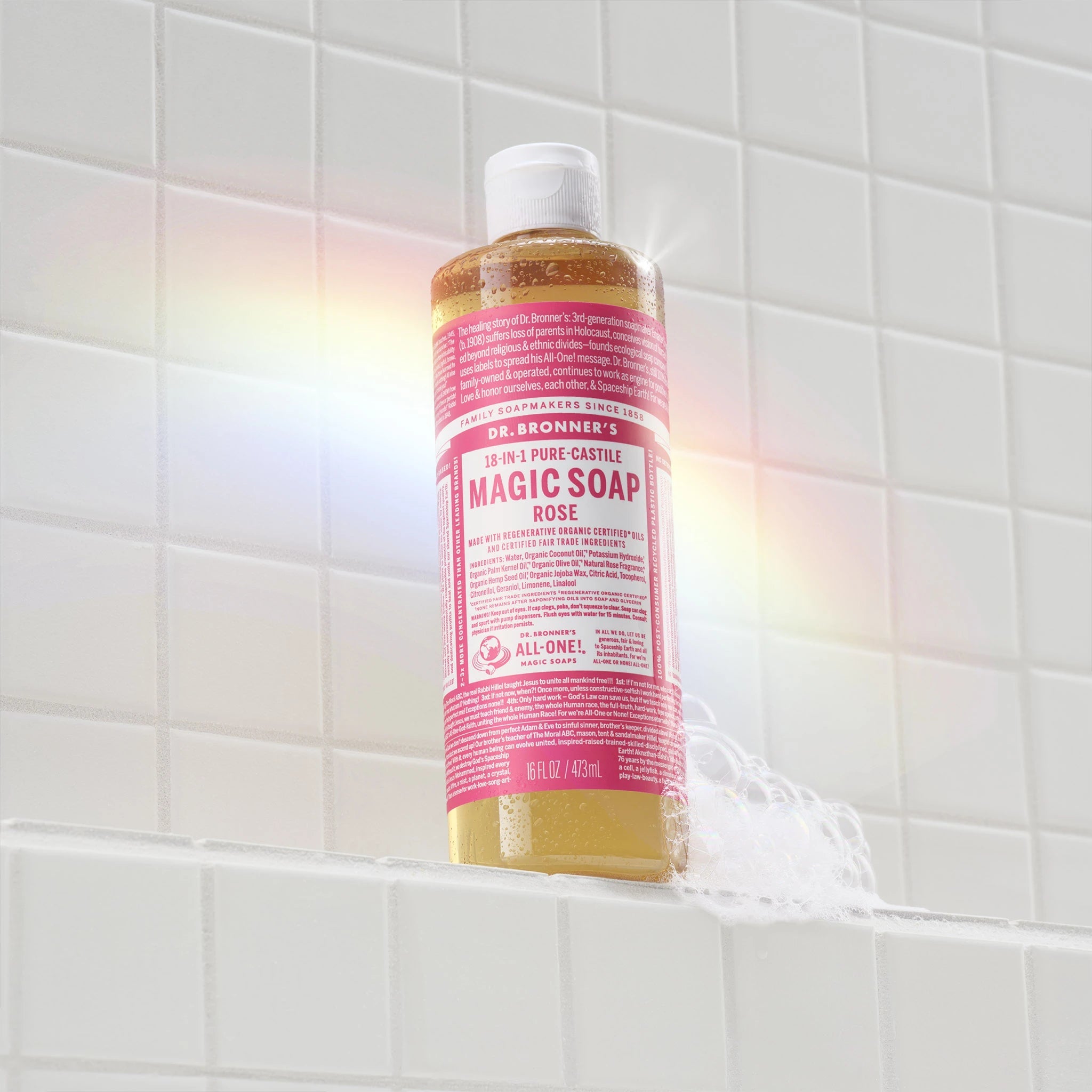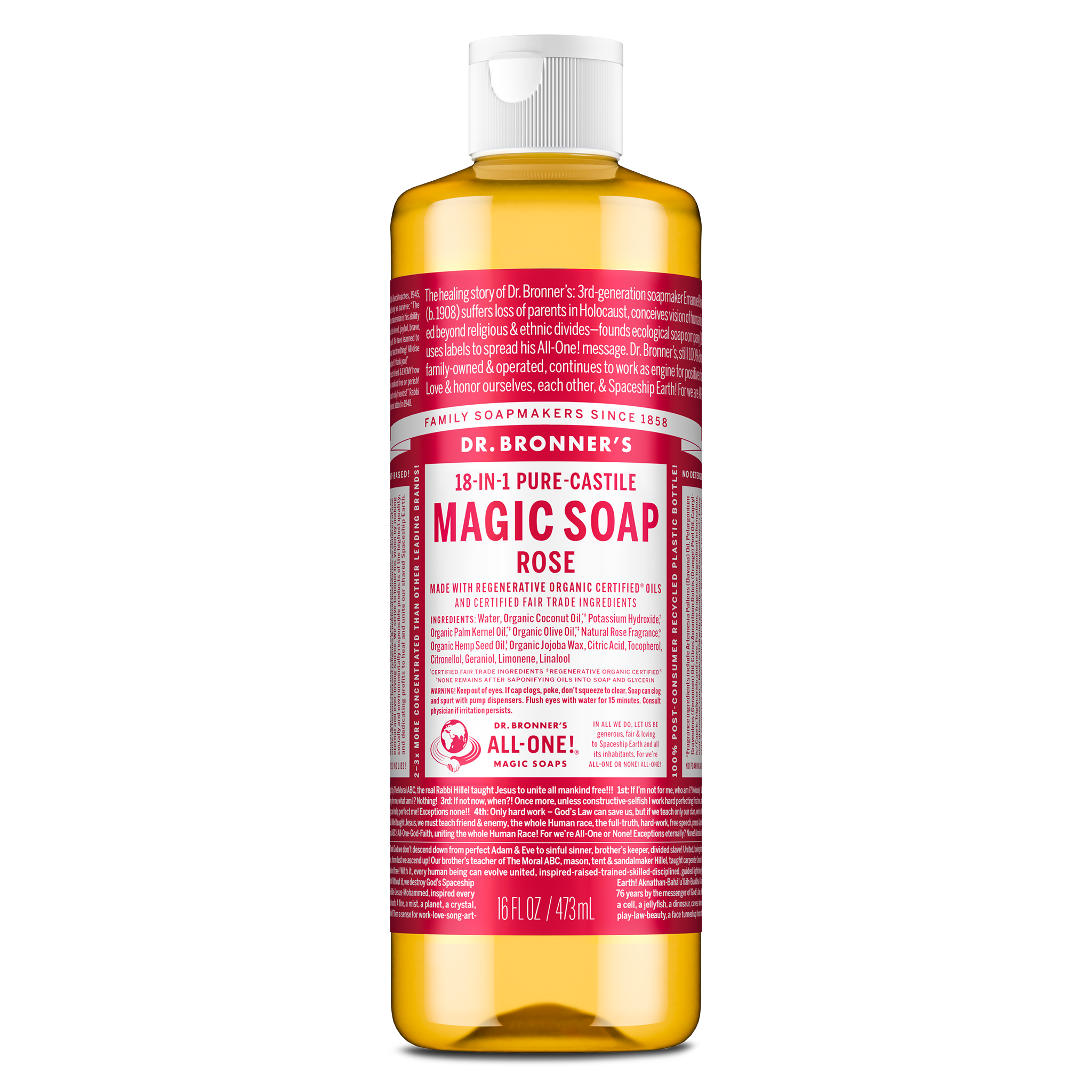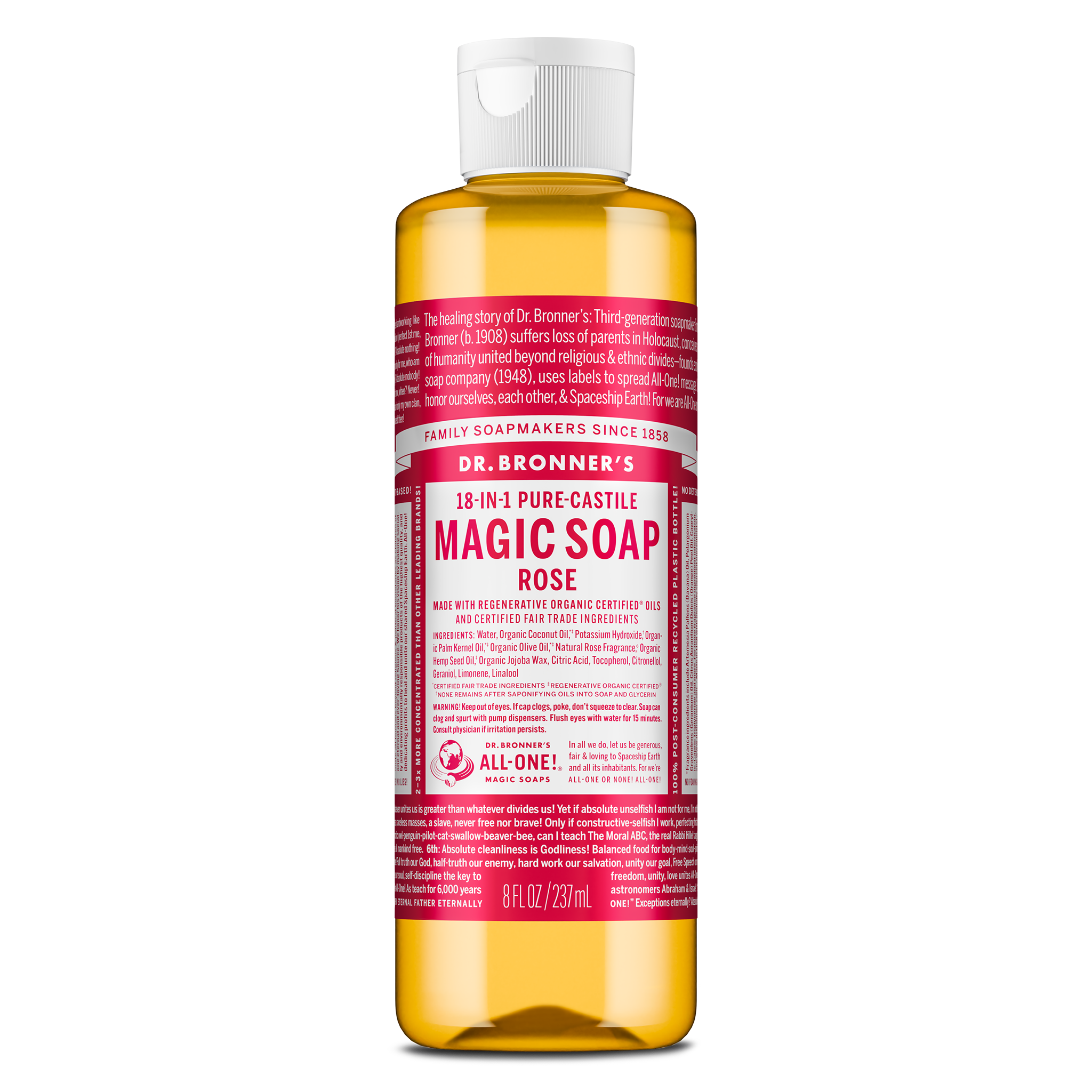 Indulge in the scent of fresh roses with Dr. Bronner’s Rose Liquid Soap. This true soap is infused with a high concentration of naturally derived rose fragrance, leaving skin feeling soft and refreshed. Made with Regenerative Organic Certified® oils, it creates a rich, luxurious lather that cleans while rinsing clean. Crafted with organic, ethically sourced ingredients—no detergents, dyes, or added foaming agents. Vegan, made with organic oils, fair trade, and EWG Verified®—shower with trust!