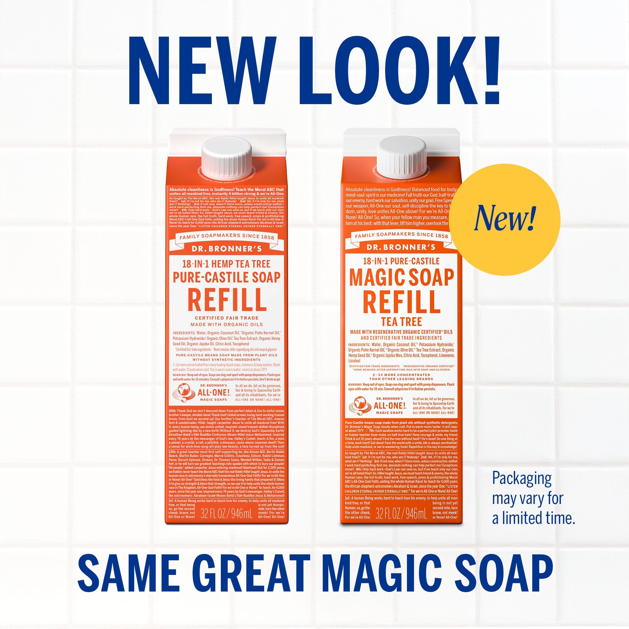 Refill your Dr. Bronner’s 100% Post-Consumer-Recycled bottle, foaming hand soap pump dispenser, and more with our 32oz. Magic Soap Refill Paper Carton! Uses 86% less plastic than one of our 32oz. recycled bottles! Sustainable made easy!